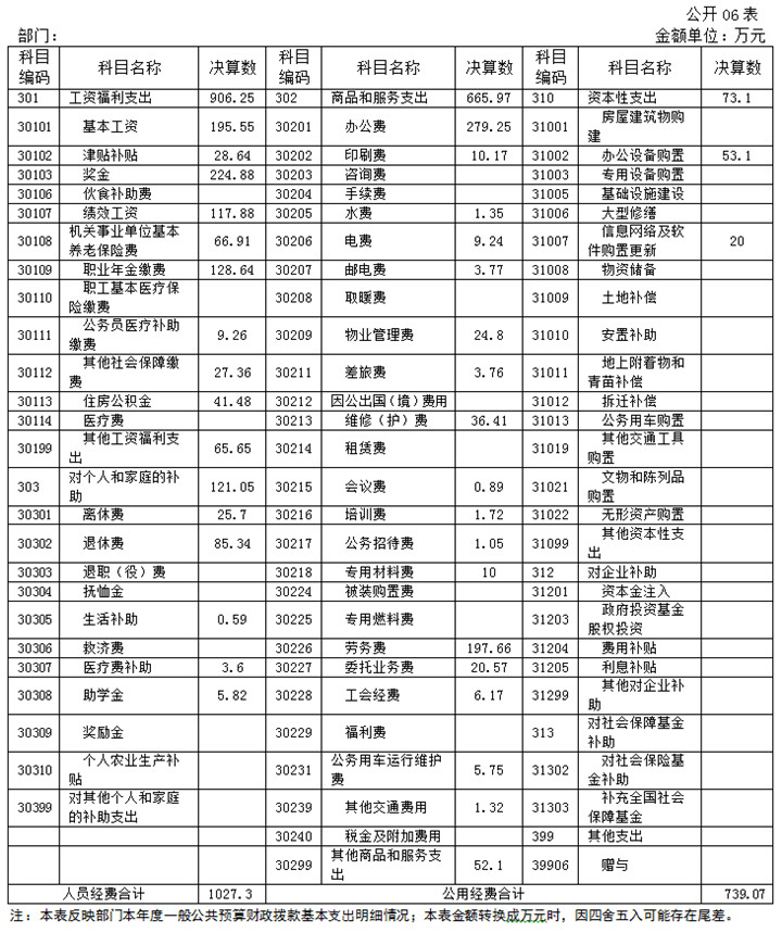 2018年度财政拨款基本支出1,300.11万元,其中人员经费997.93万元,主要包括:基本工资、津贴补贴、奖金、伙食补助费、绩效工资、机关事业单位基本养老保险费、职业年金缴费、职工基本医疗保险缴费、公务员医疗补助缴费、其他社会保障缴费、住房公积金、医疗费、其他工资福利支出、离休费、退休费、抚恤金、生活补助、医疗费补助、助学金、奖励金、对其他个人和家庭的补助支出;公用经费302.18万元,主要包括:办公费、印刷费、咨询费、手续费、水费、电费、邮电费、取暖费、物业管理费、差旅费、维修(护)费、租赁费、会议费、培训费、公务接待费、专用材料费、劳务费、委托业务费、工会经费、福利费、公务用车运行维护费、其他交通费用、税金及附加费用、其他商品服务支出、办公设备购置、专用设备购置、信息网络及软件购置更新、其他支出等。