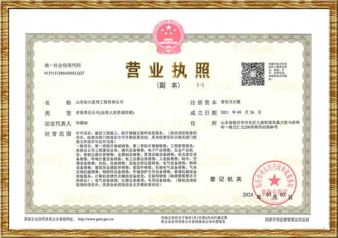 资质包括医用中心供氧系统、医用中心负压吸引系统、医护对讲系统、医院氧气管道医用气体工程安装、医疗气体系统工程、医院手术室净化工程、层流洁净手术室装修、实验室建设装饰净化工程、无尘车间净化工程设备的生产加工、批发销售与安装施工资质(部分资质文件未展示,可索取查阅)。