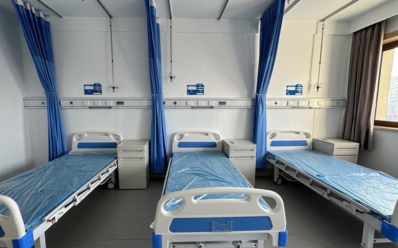 病房床头安装铝合金设备带,每个床头安装氧气接口、吸引接口、呼叫器、开关插座和照明设备。