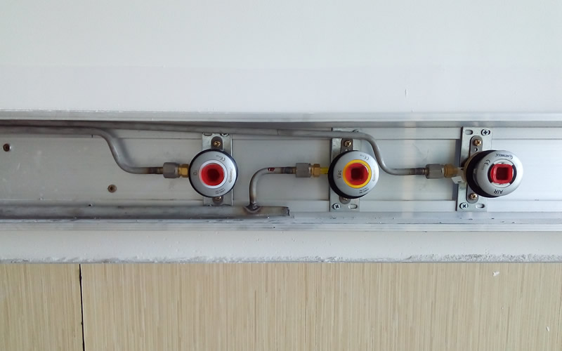 1.我们要根据病房的需要配置病房的氧气接头(一般都是根据床位数)。铝合金设备带中可以隐藏室内管道中。